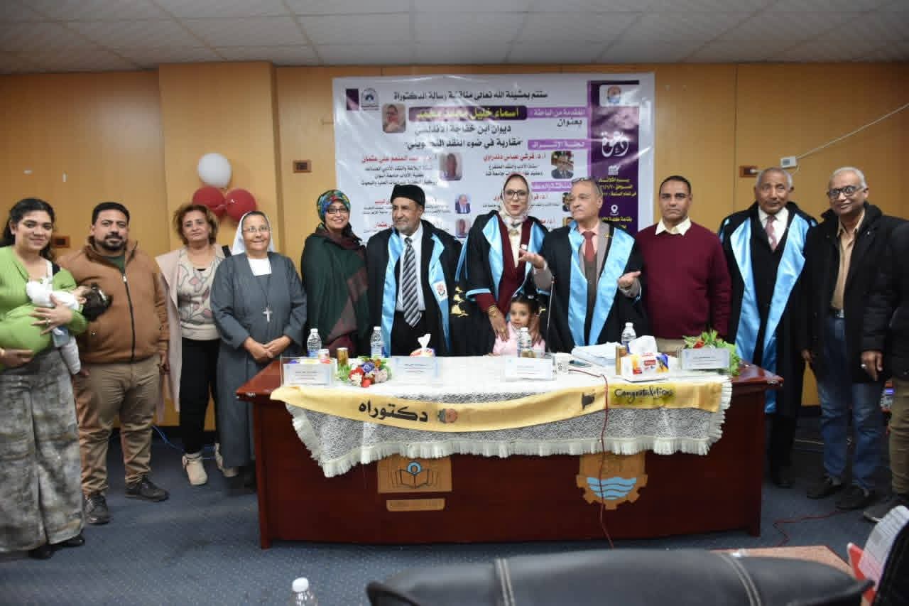 حصلت الباحثة الدكتورة اسماءخليل محمد محمد علي درجة الدكتوراه فى الآداب بإمتياز مع مرتبةالشرف الأولى من كليةالآداب جامعةأسوان وتداول رسالتها مع الجامعات المصرية والعربية تحت عنوان (ديوان ابن خفاجةالأندلسي مقاربةفي النقدالتكويني) وسط حضور عدد كبير من أدباء أسوان والأقصر وأسيوط مؤسس ملتقى سيانا الثقافي بمدينة إسنا رئيس نادي أدب الأقصر المركزي في الفترة ٢٠٢٣: ٢٠٢٥ شاركت في العديد من المؤتمرات أهمها مؤتمر أدباء مصر ٢٠٢٥ ببحث عنوانه العزاء الأخير أكتوبر والأدب الشعبي دراسة ميدانية حصلت على ليسانس آداب لغة عربية ٢٠١١م وبعدها تمهيدي الماجستير ٢٠١٣ وحصلت على درجة الماجستير ٢٠٢٠م عن أطروحتها "النقد التكويني ودوره في فك شفرات النص ديوان ماذا تبقى له؟! أنموذجا"بدرجة ممتاز مع التوصية بالطبع والتداول بين الجامعات المصرية المنتج الأدبي قدمت كثير منها : الكرنكي أنسنة المكان في قصص يحيى الطاهر عبد الله وديكود سيناريوهات تخليق النص وفك الشفرات حصلت على جائزة ابن خصيب ٢٠١٩ في فرع المقال النقدي ومن جانبها تتقدم الباحثة بخالص الشكر والتقدير لكل الأساتذة الأفاضل بلجنتي الإشراف والمناقشة، وإلى الاهل و أعمامها وأخوالها وعائلتها الكبرى والصغرى